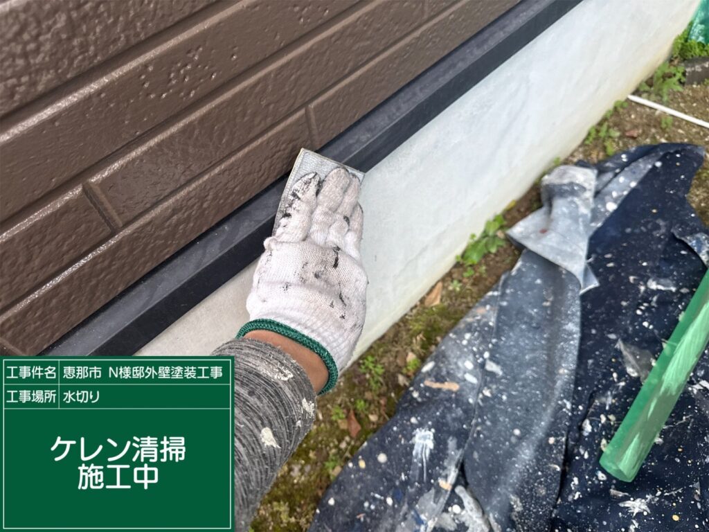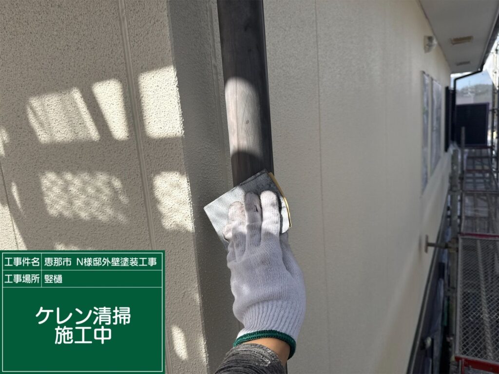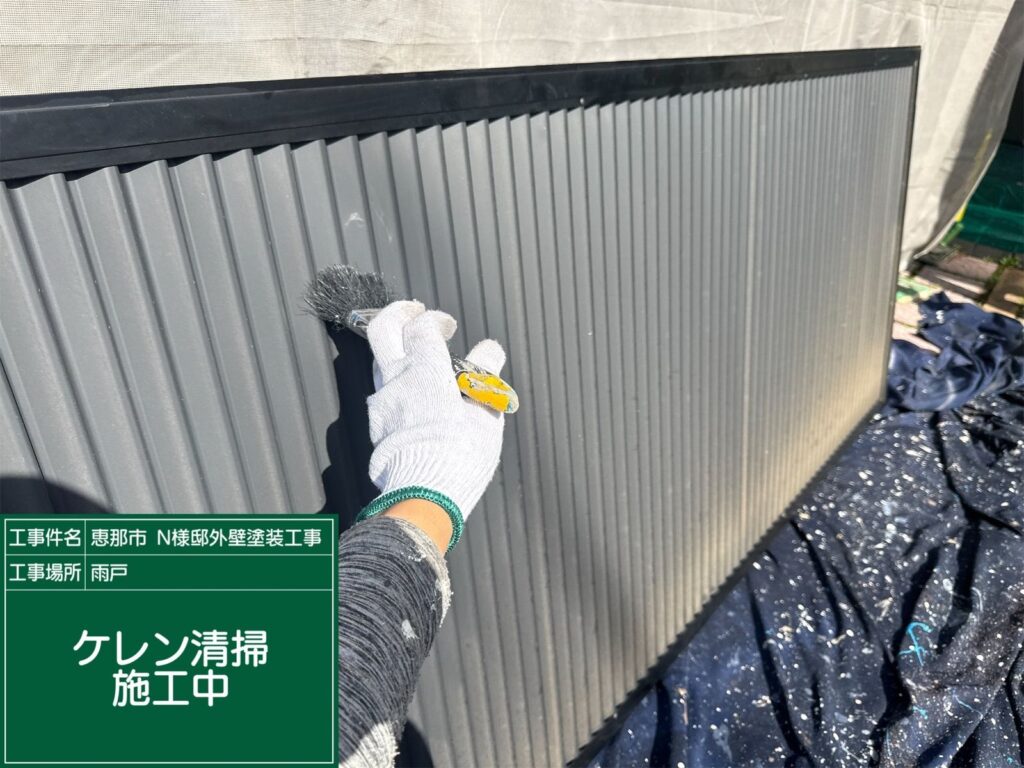ケレン作業中です。 ケレンとは、汚れ、サビ、旧塗膜等を落とし塗料の付着をよくするための作業です。