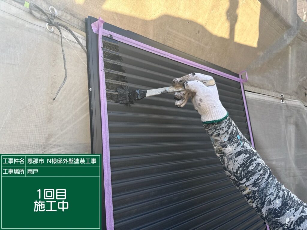上塗り塗装1回目の作業中です。細かい箇所は刷毛を使って丁寧に塗布していきます。