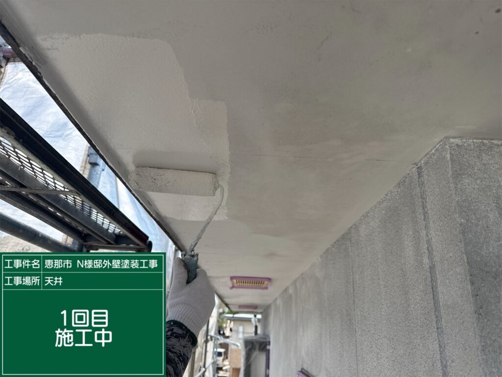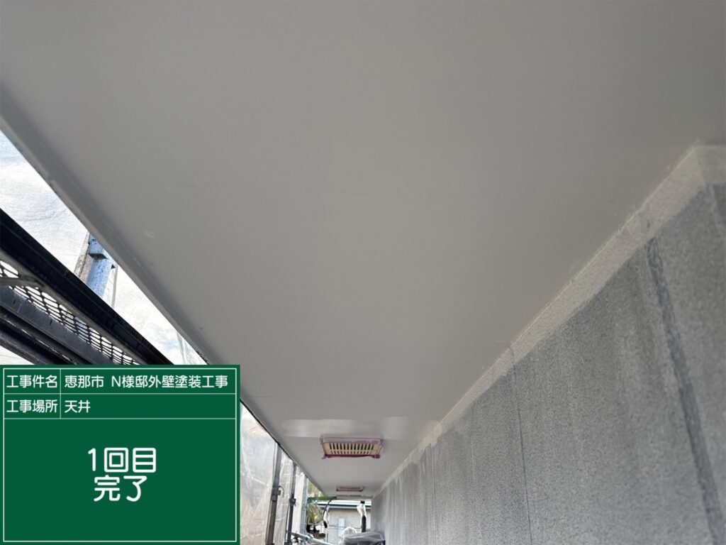 軒天塗装1回目の施工中です。 1回目の完了。軒天は2回塗装をしていきます。