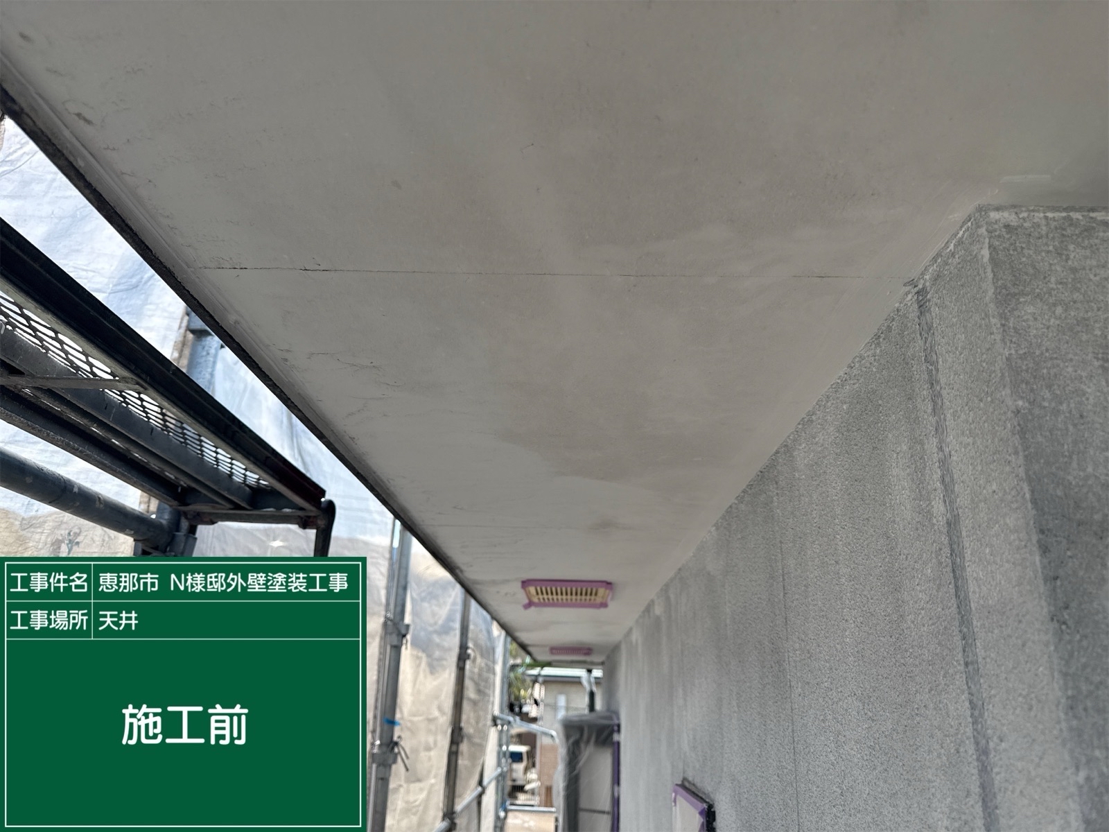 軒天塗装1回目の施工中です。 1回目の完了。軒天は2回塗装をしていきます。