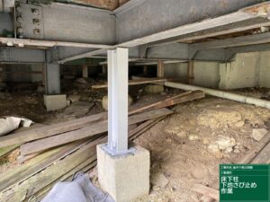 (有)日成ホーム(プロタイムズ恵那店)です。 恵那市大井町の公民館の塗装工事を施工致します 引き続き、錆止めを塗布していきます。 今回は床下の柱です。 湿気もたまりやすく全体的にサビが発生している状態でした。 柱の劣化に […]