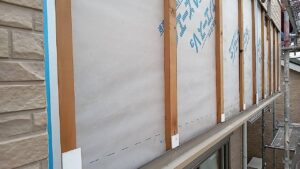 中津川市の外壁塗装の現場で、窓などの養生が完了しました。