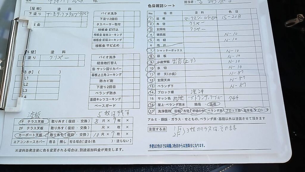 軒天井、破風板、鼻隠し、雨樋、玄関上の天井、小庇の色目、とご主人様、奥様と、すべて確認をしながら記入していきます。
