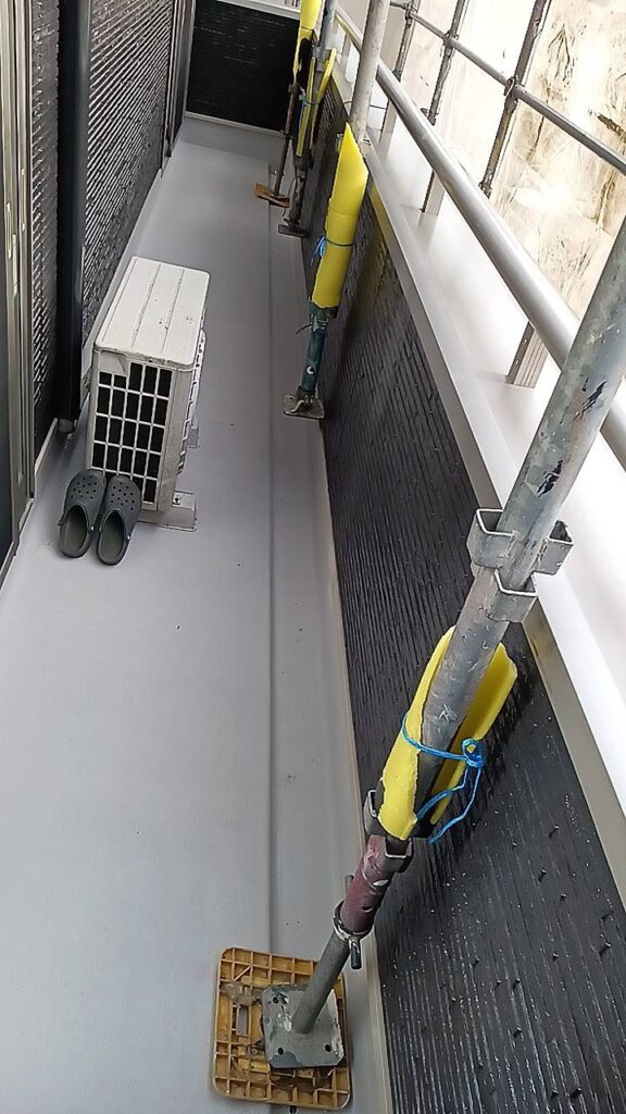 中津川市で外壁塗装の最終のチェックを行います。足場のジャッキを上げてベランダ防水の塗膜に異常がないか確認します。