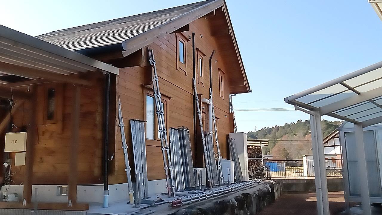 中津川市で足場の組立です。外壁塗装をガードラックアクアにて行います。