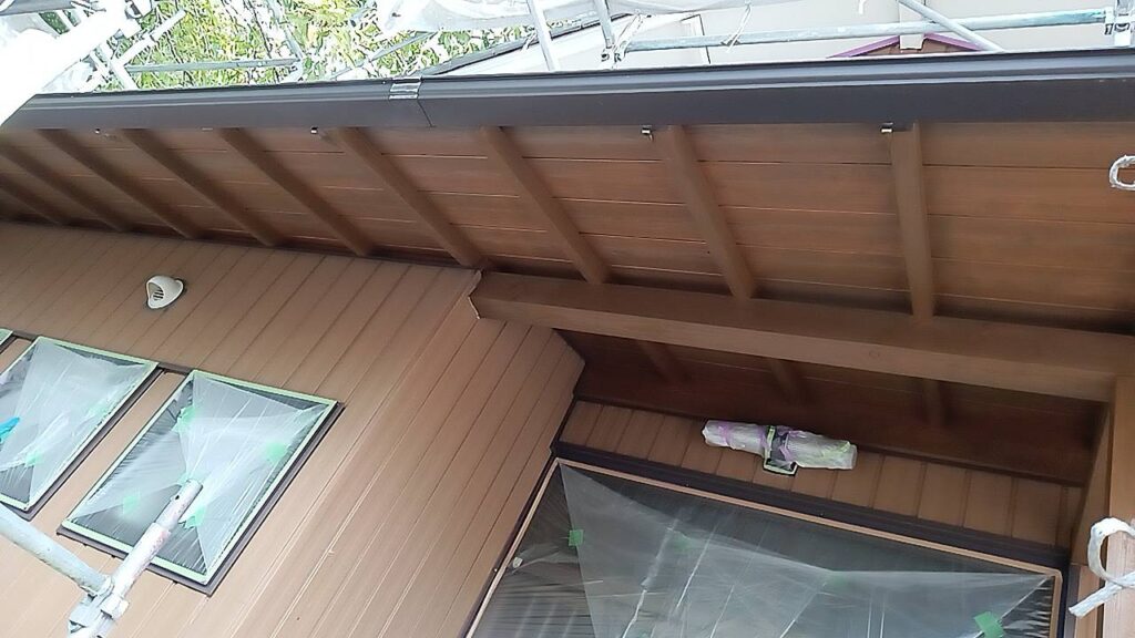 窓にペンキが付かないように、ビニールにてしっかりと養生しています。