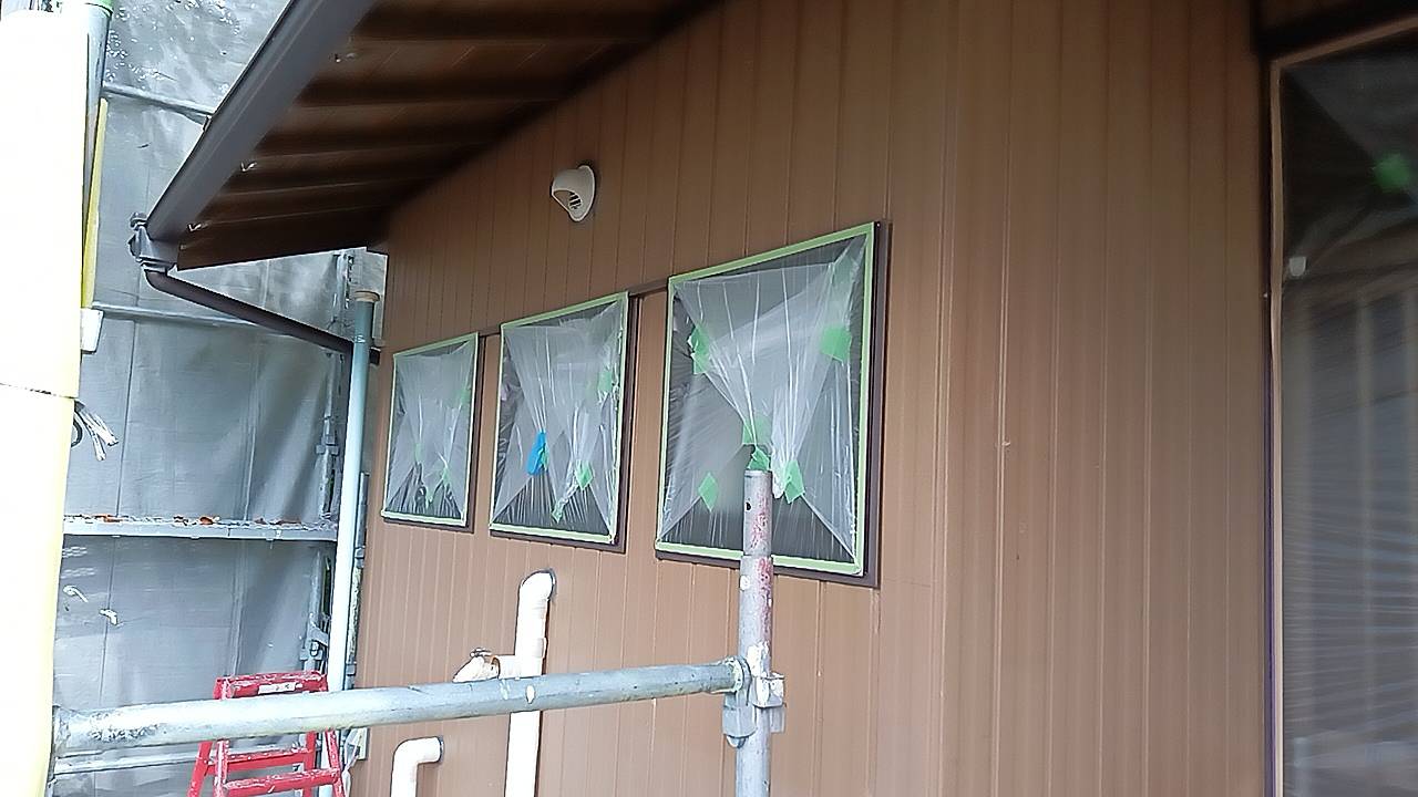 窓にペンキが付かないように、ビニールにてしっかりと養生しています。