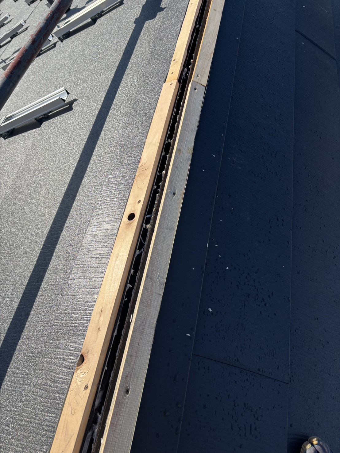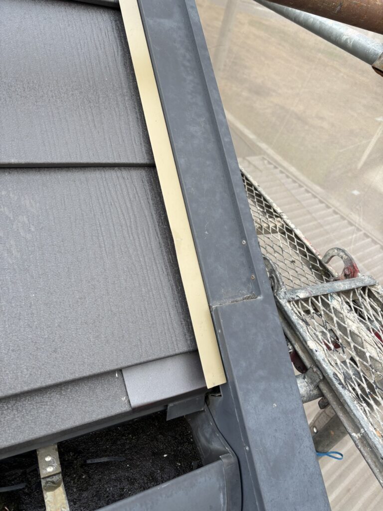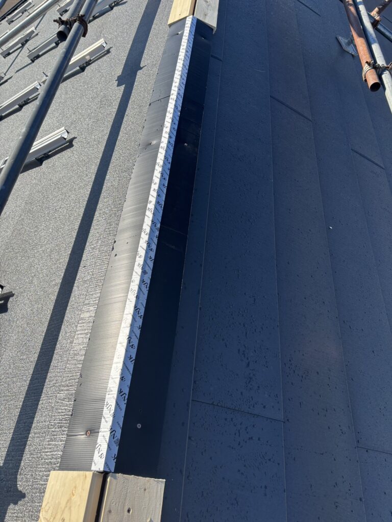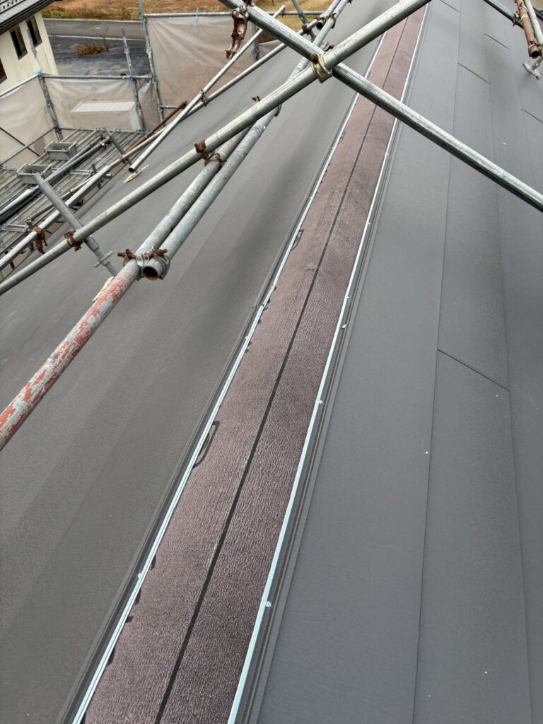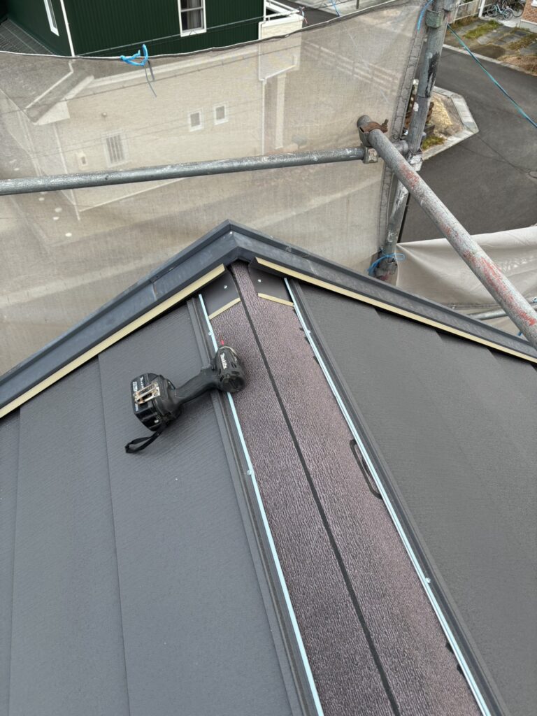 大屋根の棟にガルバリウムの棟の板金を取り付けていきます。
