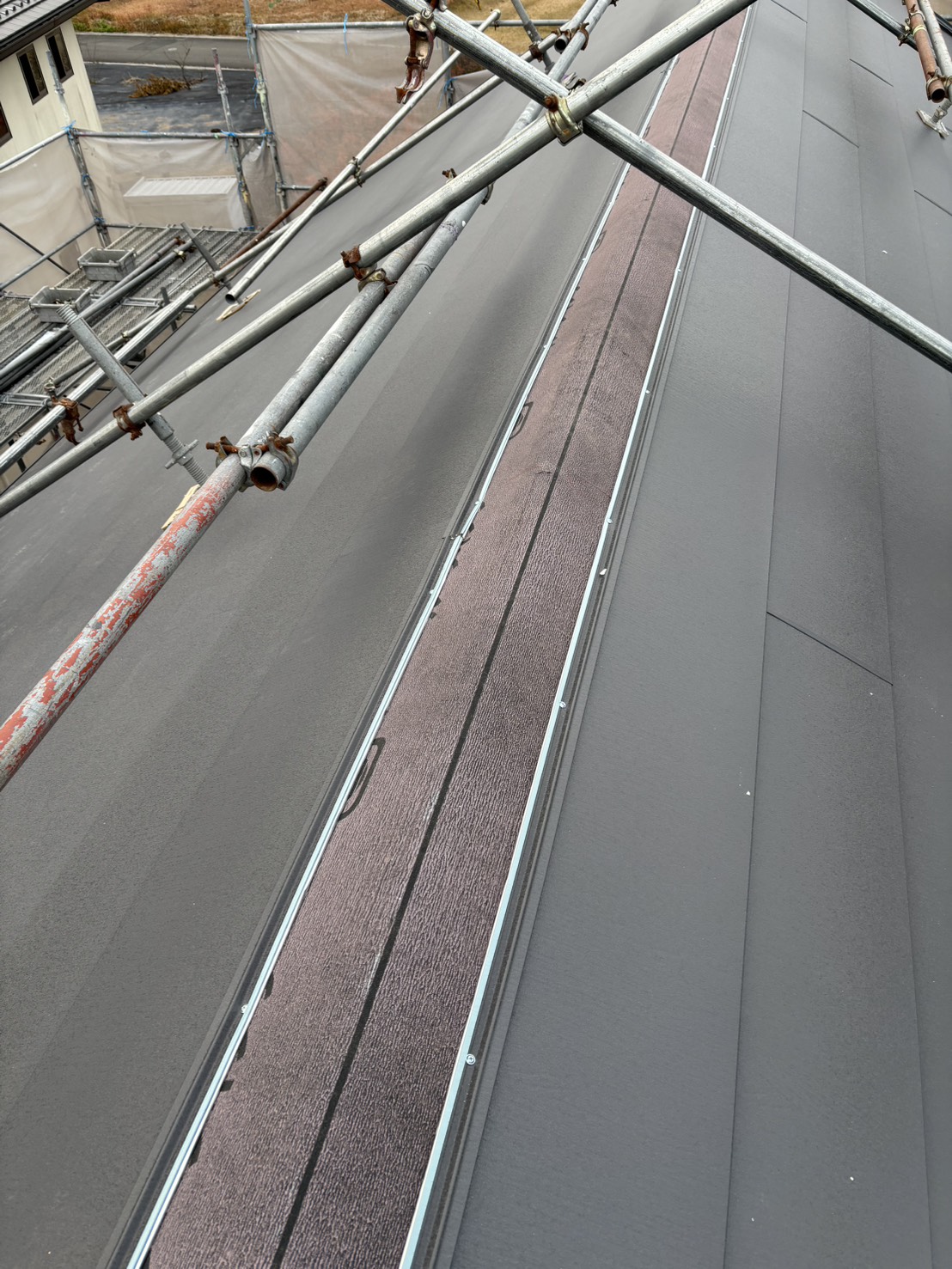 大屋根の棟にルーフィングが施工してあります。