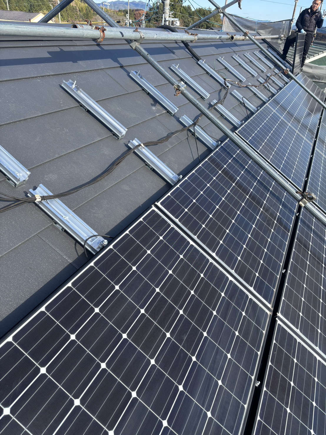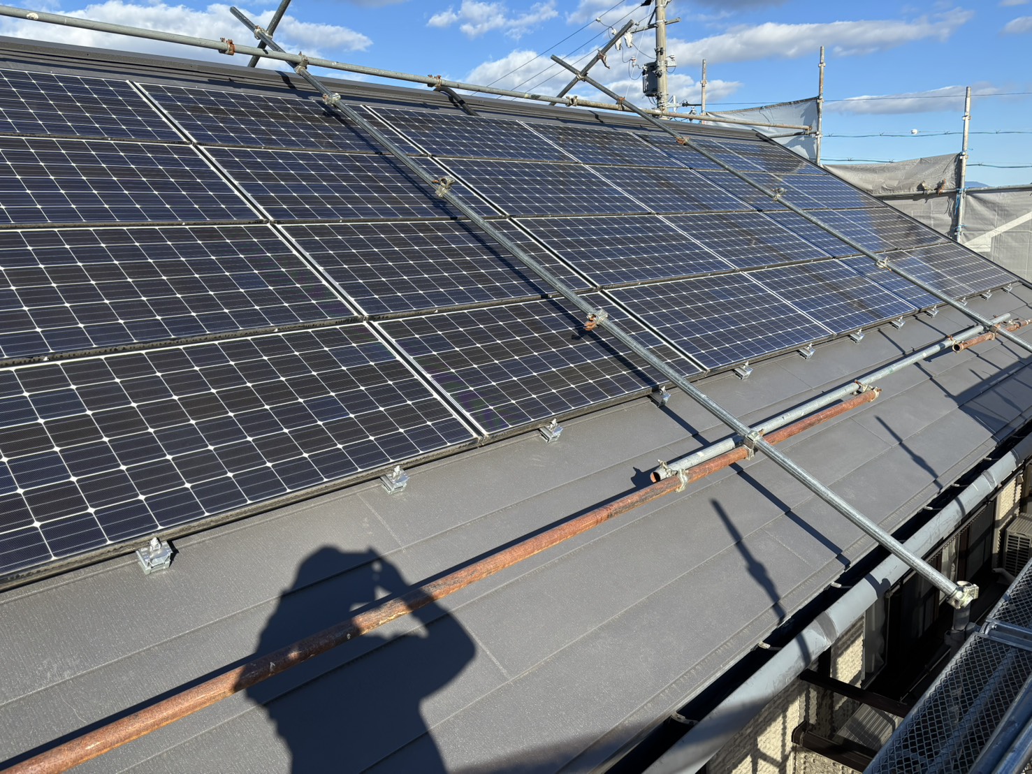 足場を組んだ後に、既設のソーラーを一度、取り外しました。