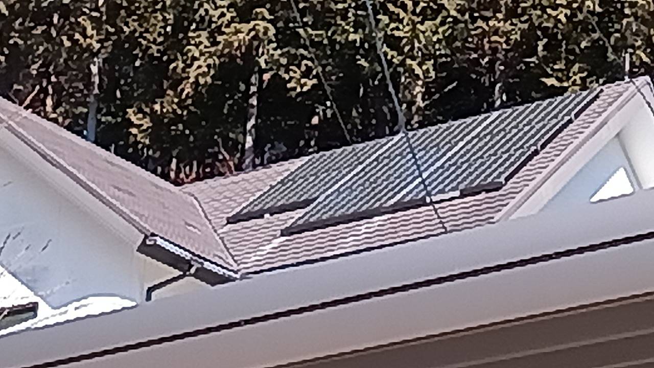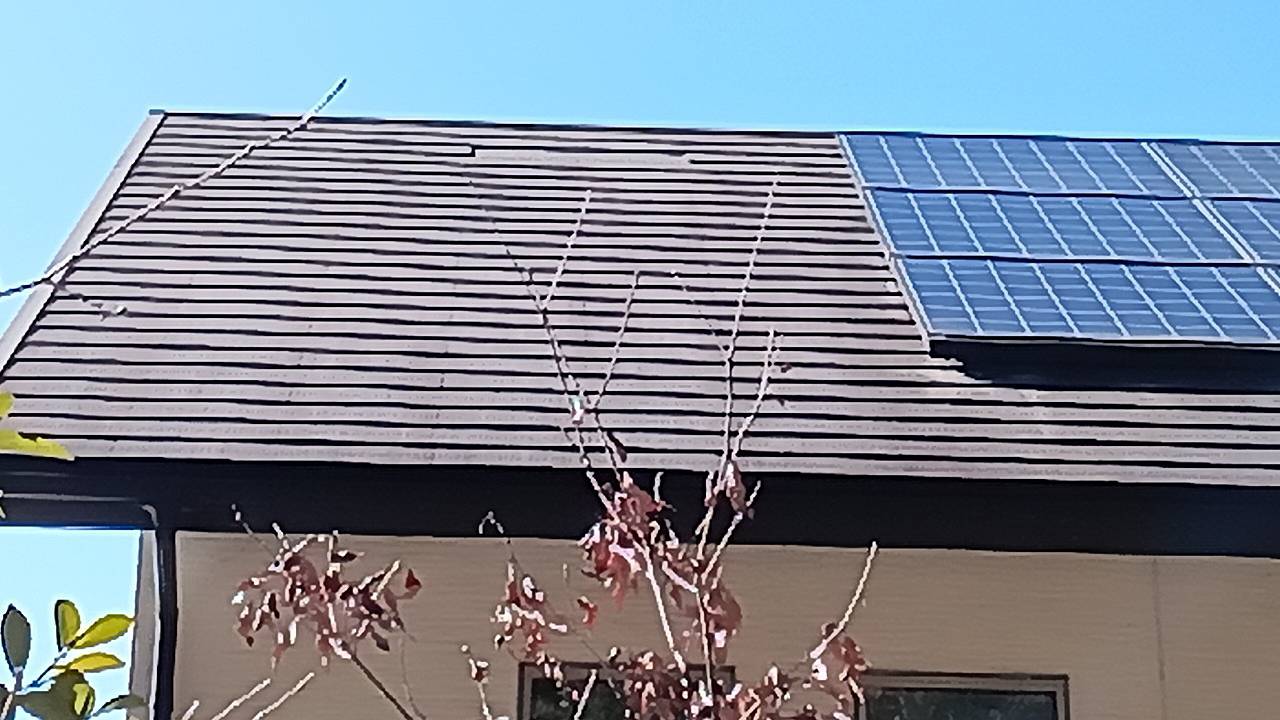 大屋根のソーラーの左下の箇所のコロニアルが捲れて落下しています。