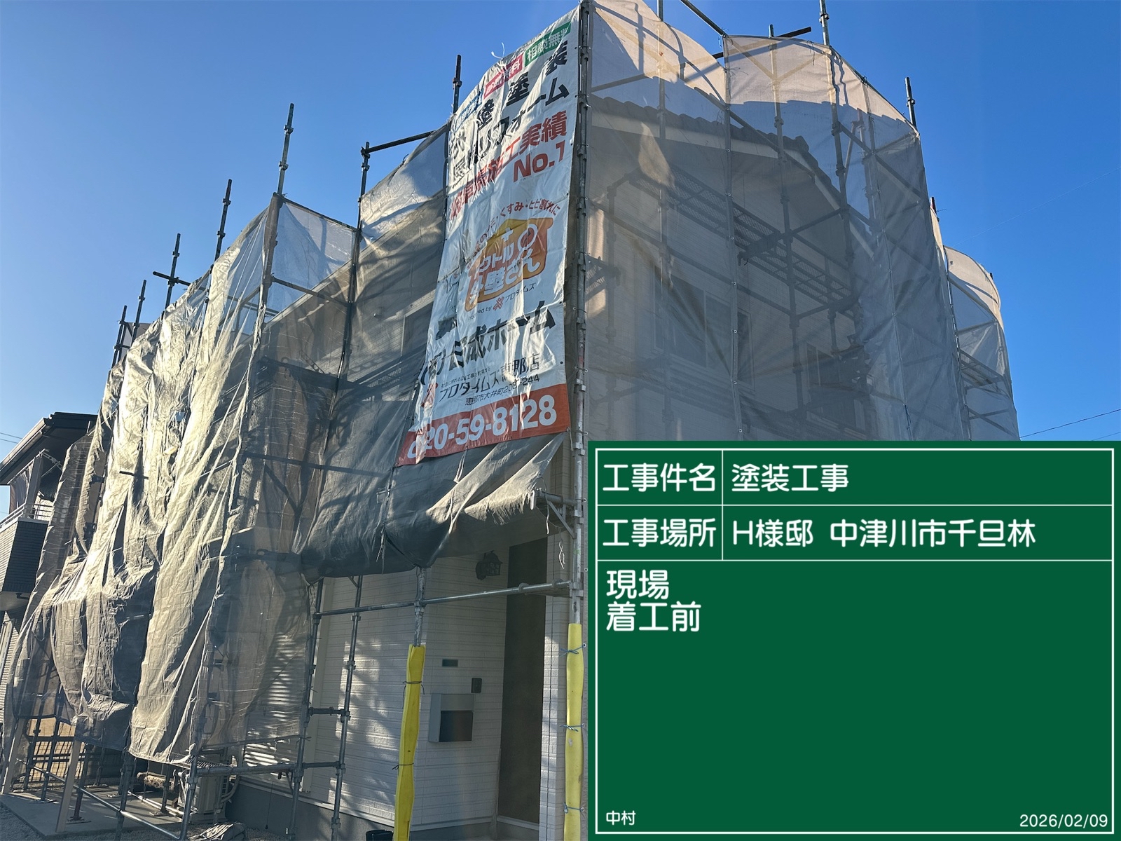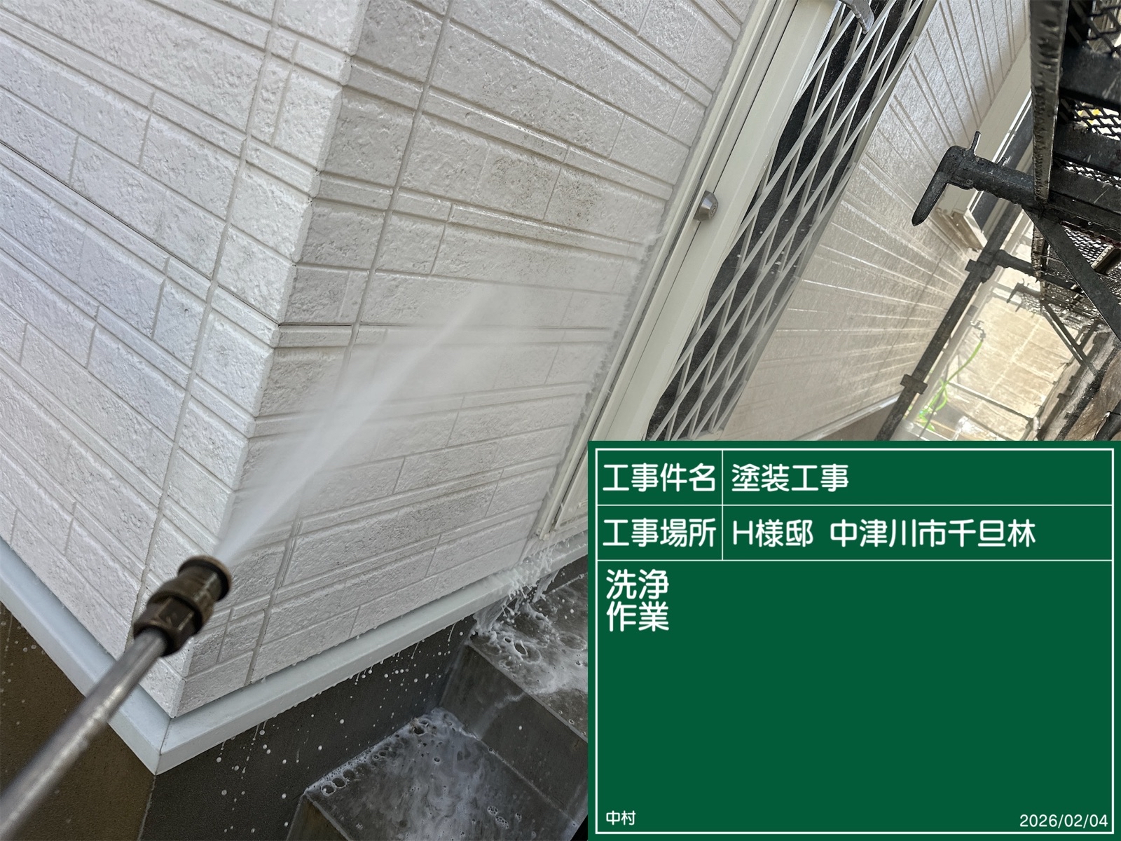 足場組立 安定した足元で塗装できるように足場を組み立てました。メッシュシートで洗浄の水や塗料の飛び散りを防ぎます。