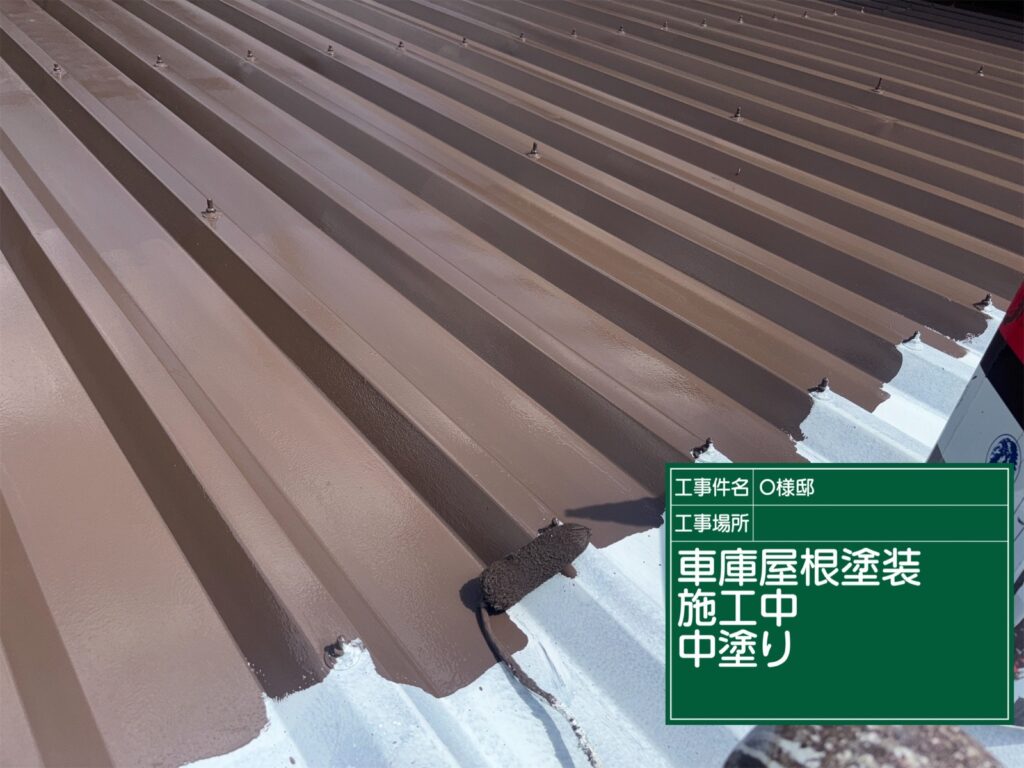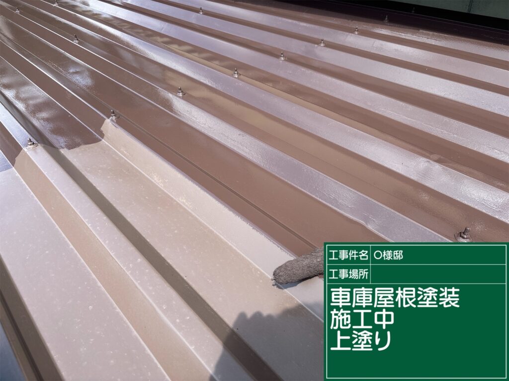 車庫の屋根の中塗り施工中