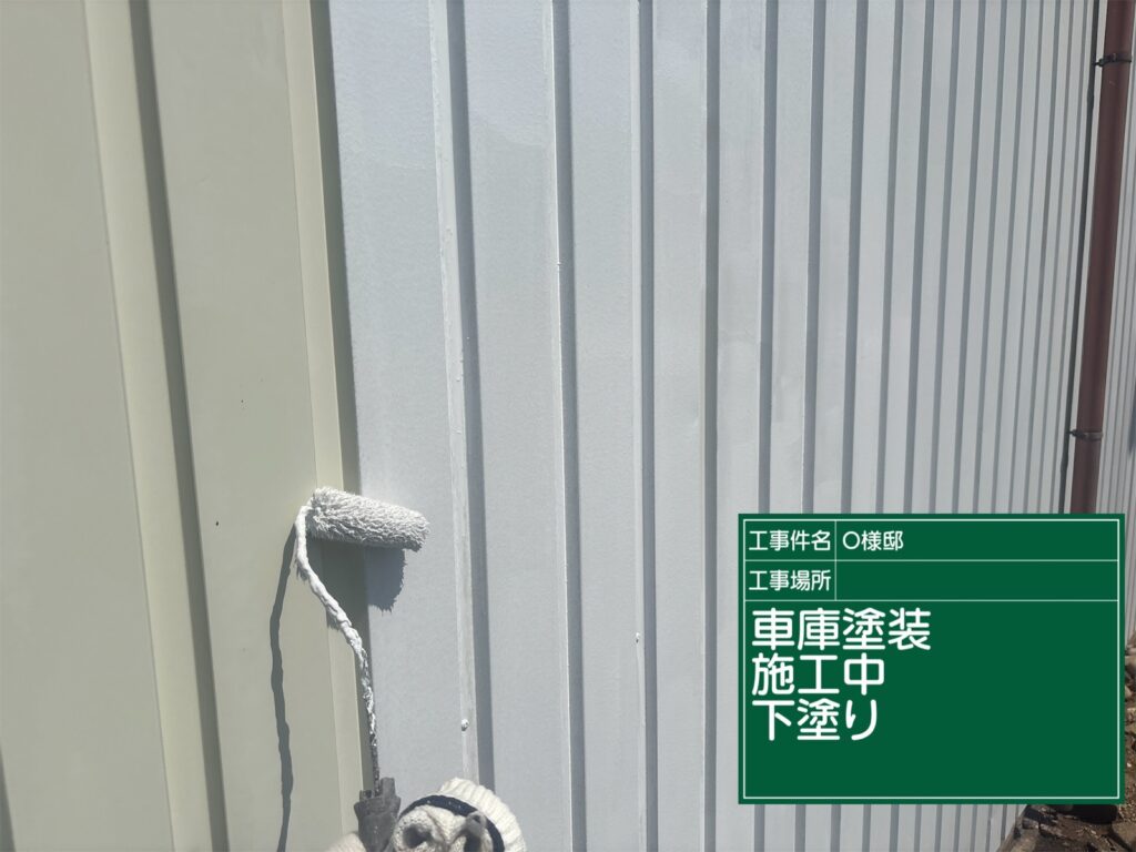 車庫の下塗り施工中